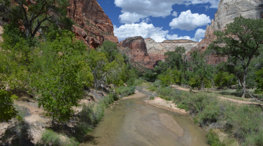 The Zion Canyon floor is a shocking, fertile green basin at the base of a jumble of mountains that huddle around it like a protective fortress. It’s the meeting point of three major geographical areas: the Great Basin to the West, the Mojave to the Southwest, and the Colorado Plateau to the East. Subsequently, it is a wild looking place. Wild in the sense of being untamed, untamable – and wild in the sense that it’s singularity causes one to stand gobsmacked on the canyon floor with their mouth hanging open.
