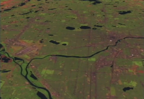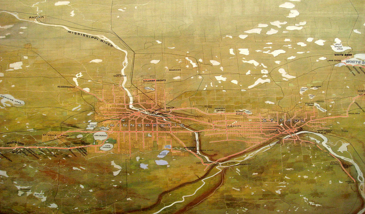 Isn’t this map beautiful though? I love the gentle dip and curve of the river, coursing through the grid of streets. The same area is mapped in below, in a 1906 map from The New Encyclopedic Atlas and Gazetteer of the World. And again in this beautiful commissioned watercolor map done by John Jager for the Twin Cities Rapid Transit Company in 1904. Finally, this map shows the area from quite a different angle. The image is from a flyby, a visual representation “as seen by the Landsat Thematic Mapper (TM) instrument. The shortwave infrared (TM band 5), infrared (TM band 4), and visible green (TM band 2) channels are displayed in the images as red, green, and blue respectively. In this combination, barren and/or recently cultivated land appears red to pink, vegetation appears green, water is dark blue, and artificial structures of concrete and asphalt appear dark grey or black.” There is the video from which this is taken. It’s fascinating. Thanks NASA, you’re rad.